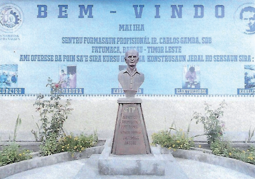 Nel maggio 2019 proprio a Fatumaca è stato inaugurato un padiglione scolastico destinato all’insegnamento tecnico e professionale. Lo si può vedere con lo zoom dalle immagini satellitari: ha il tetto rosso nuovo. Quell’edificio è stato intitolato a Carlo Gamba. Dal satellite non si vede che davanti al padiglione hanno eretto un busto che ritrae nostro zio sorridente.