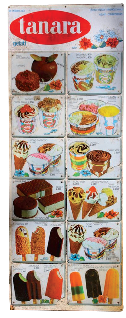 Ma torniamo ai gelati che allora si sceglievano ignorando il rapporto “qualità prezzo”, il km zero, la confezione riciclabile e l’olio di palma free. Noi bambini a ogni estate imparavamo a memoria nomi, prezzi e foto dal colorato cartellone in lamiera accanto al frigo dei bar. Ricordo il Pinguino che esiste ancor oggi ed è padre di tutti i ricoperti, ma allora era “il” Pinguino. E il Fortunello e il Camillino: due biscotti scuri con in mezzo il gelato. Poi vennero il ghiacciolo di tre colori a piramide e quello alla Coca Cola e l’inquietante gusto Puffi blu intenso.