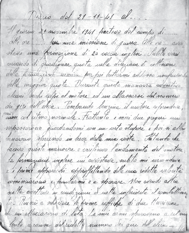 “Il giorno 21 novembre 1941 partivo dal campo di…. alle ore…. per una missione di guerra. Alle ore… avvistavo una formazione di 20 caccia inglesi. Subito virai cercando di guadagnare quota nella direzione della formazione nemica, per poi buttarmi addosso usufruendo della maggiore quota.