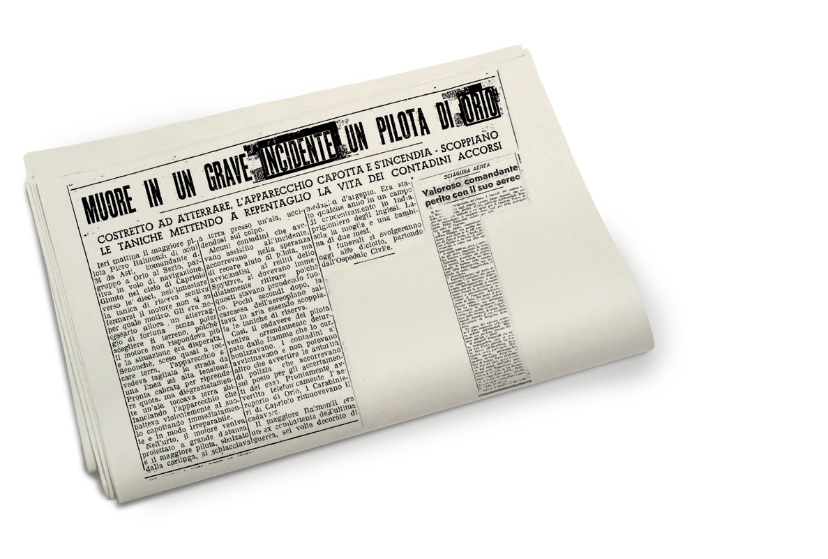 La bambina, che diventerà insegnante di tedesco al Liceo scientifico di Asti, ha custodito il diario memoriale del padre che il destino non le ha voluto far conoscere. Quando lei aveva solo due mesi di vita, il 5 luglio del 1949 il maggiore Raimondi di base a Orio al Serio, dove oggi c’è l’aeroporto di Bergamo, perde la vita a causa di un’avaria dell’aereo su cui volava. Ironia della sorte era un caccia Spitfire, apparecchi residuati bellici che gli inglesi hanno ceduto all’Italia repubblicana, per ricostituire l’aviazione militare. L’incidente ha vasta eco sui giornali della zona e la notizia arriva ad Asti. I funerali dell’ufficiale si celebrano nella chiesa di San Pietro gremita di folla.