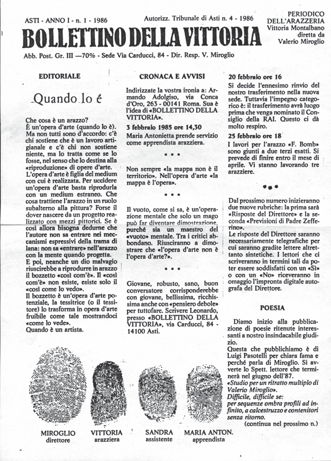 Sul primo numero del Bollettino della Vittoria Miroglio esprime la sua filosofia e personale visione dell’arazzo. «Che cos’è un arazzo? È un’opera d’arte (quando lo è). Ma non tutti sono d’accordo: c’è chi sostiene che è un lavoro artigianale e c’è chi non sostiene niente, ma lo tratta come se lo fosse, nel senso che lo destina alla “riproduzione” di opera d’arte. L’opera d’arte è figlia del medium con cui è realizzata. Per uccidere un’opera d’arte basta riprodurla con un medium estraneo. Che cosa trattiene l’arazzo in un ruolo subalterno alla pittura? Forse il dover nascere da un progetto realizzato con mezzi pittorici. Se è così, allora bisogna dedurne che l’autore non sa entrare nei meccanismi espressivi della trama di lana: non sa “entrare” nell’arazzo con la mente quando progetta. E poi, neanche un dio malvagio riuscirebbe a riprodurre in arazzo il bozzetto “così com’è”. Il “così com’è” non esiste, esiste solo il “così come lo vedo”. Il bozzetto è un’opera d’arte potenziale, la tessitrice (o il tessitore) lo trasforma in opera d’arte fruibile come tale mostrandoci “come lo vede”. Quando è un artista». (Bollettino della Vittoria, Anno I, n. 1, 1986).