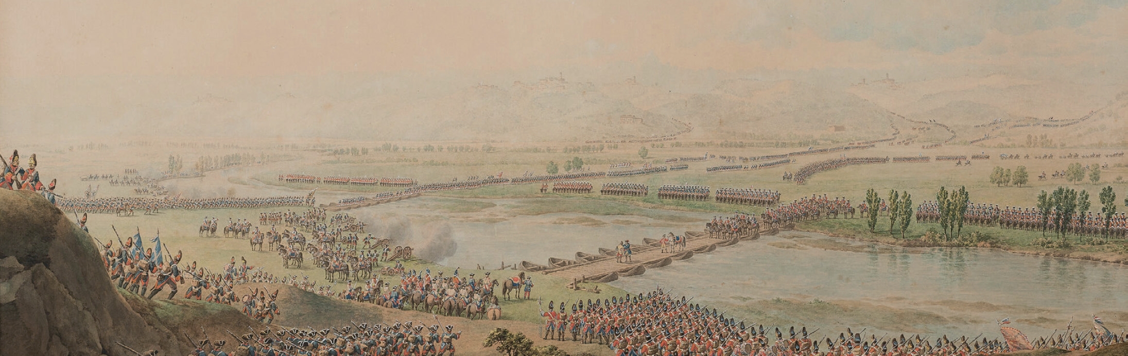 Benché Bagetti avesse più di una volta seguito di persona gli eserciti per ritrarli in battaglia, la tempera che ci interessa non poteva averla realizzata dal vivo. Perché la scena con tutti quei personaggi era avvenuta più di un secolo prima, sulle rive di un fiume nel sud del Piemonte. L’anno era il 1706, il fiume era il Tanaro, i personaggi erano i fanti e i cavalieri dell’esercito imperiale austriaco. Il titolo, un po’ didascalico forse, con cui è stato archiviato il quadro di Bagetti è “Incontro di Vittorio Amedeo II e del principe Eugenio sul Tanaro”.