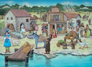 un metro. È una veduta dalle tonalità chiare che nella parte inferiore brulica di personaggi dipinti fino al minimo dettaglio.