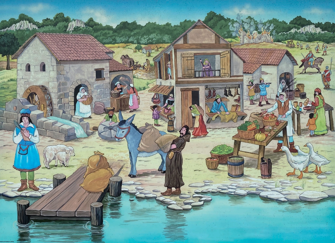 Per semplicità, i due pannelli didattici dedicati al medioevo raffigurano la fortificazione nei pressi del fiume; in realtà, si trovava sulla collina dove ancora oggi è appoggiato il paese. Il castello ebbe alterne fortune, fu anche dato alle fiamme dal Barbarossa ma probabilmente già nel XVI secolo cadeva in rovina. La vita, però, proseguiva placida lungo le sponde del Tanaro.