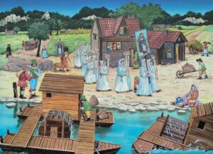 ormeggiati due mulini natanti. Montati su barconi assicurati alla riva attraverso robusti ormeggi, sfruttavano la corrente mentre galleggiavano. Si trattava di una soluzione economica e talvolta succedeva che il mulino, il macinato e lo stesso mugnaio fossero trascinati via dal fiume. Erano tempi