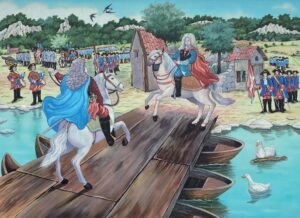 Una veduta ritrae l’incontro sul Tanaro tra Vittorio Amedeo II ed Eugenio di Savoia