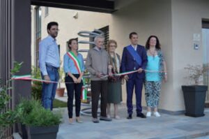 Inaugurazione di un nuovo capannone, nel 2017: da sinistra Marco Prainito, il sindaco di Belveglio Michela Kretaz, Carlo Giovine e sua moglie Giovanna Balbo, l’allora presidente della Provincia Marco Gabusi e Pia Giovine
